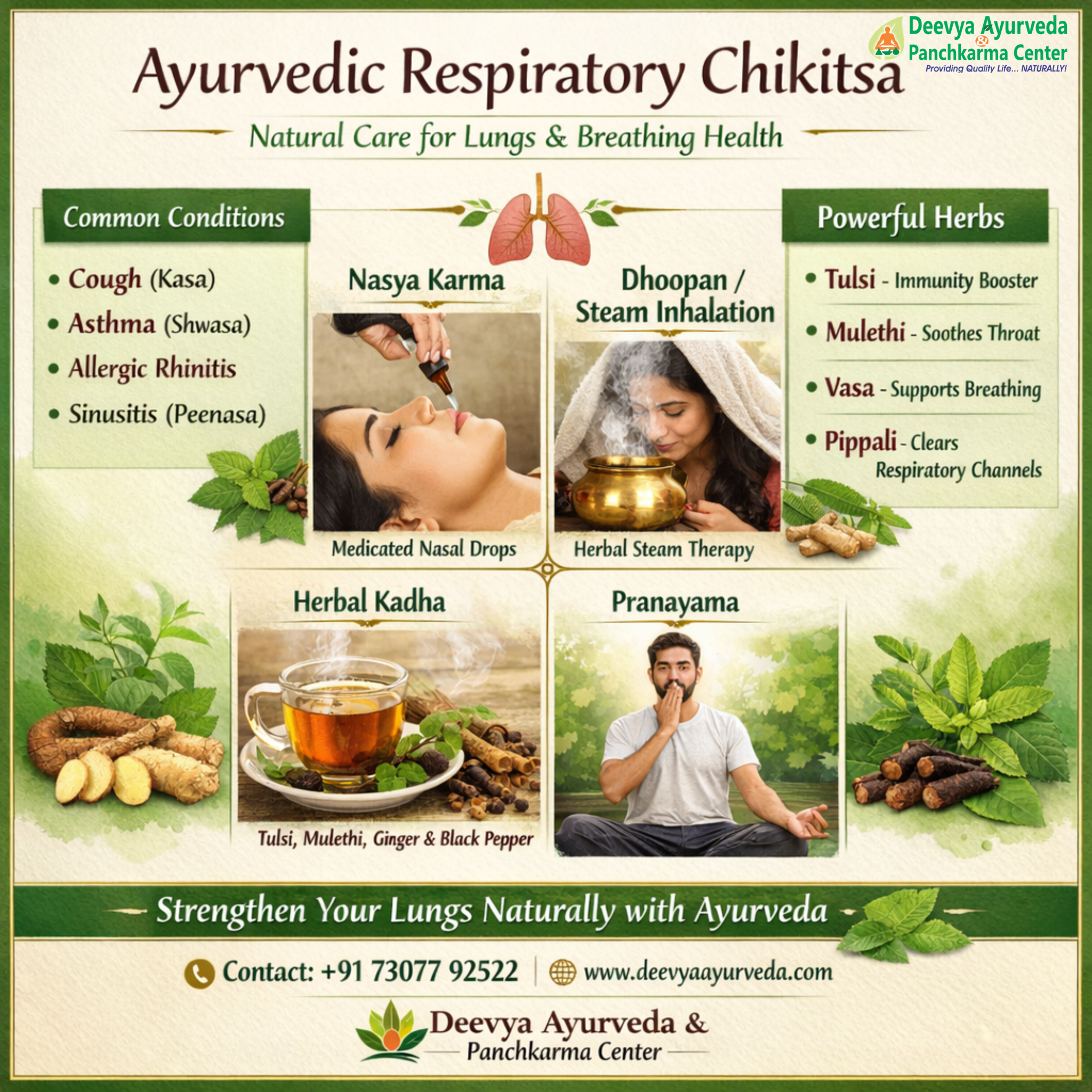 Therapies like Nasya, Dhoopan, Vaman and Panchkarma detox support deep respiratory cleansing and long-term relief from conditions like cough, asthma, sinusitis, and bronchitis.