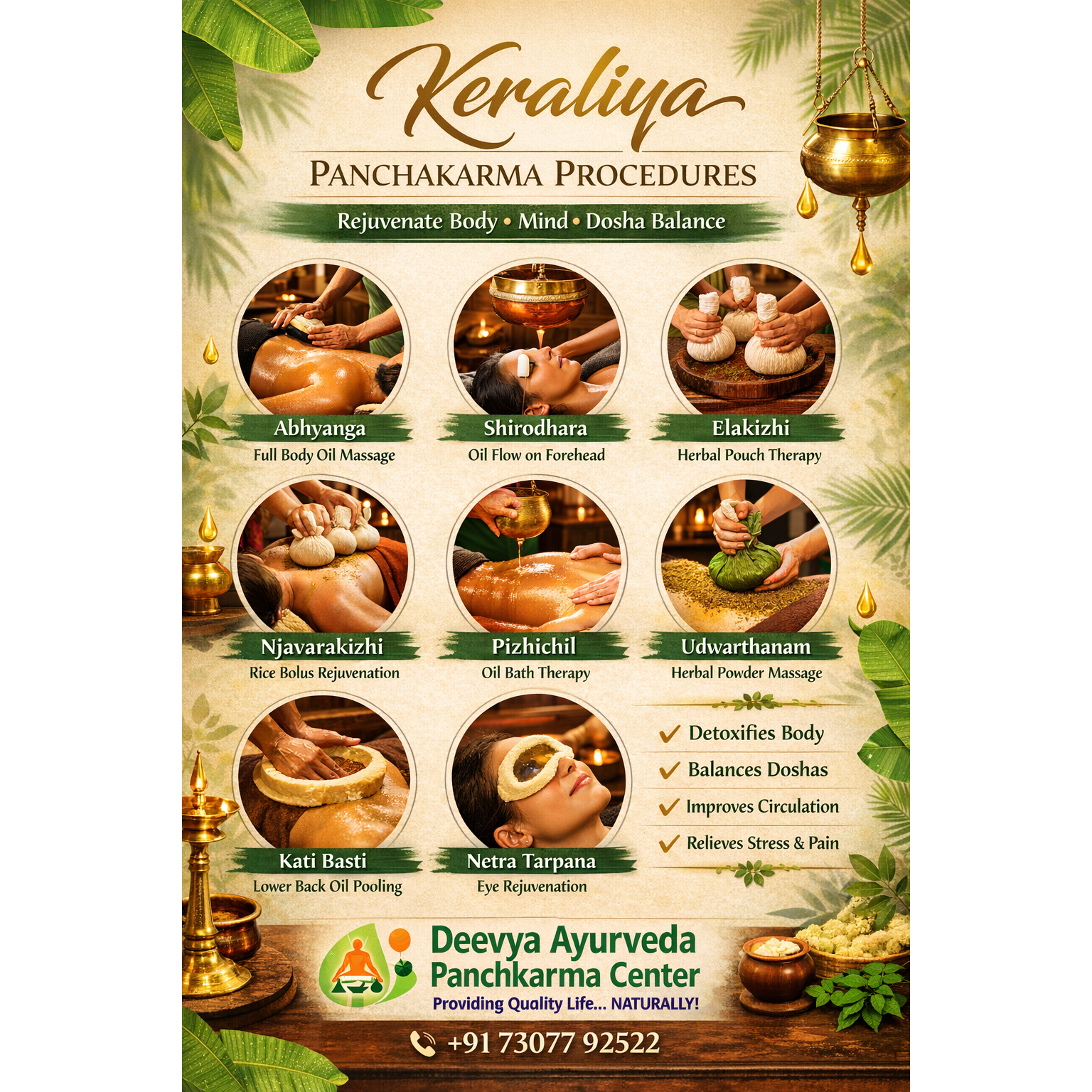 Experience the true power of Panchkarma with Deevya Ayurveda & Panchkarma Center. Our authentic Panchkarma therapies are designed to detoxify, rejuvenate, and restore your body naturally. With the guidance of the Experts of Deevya Ayurveda, every Panchkarma treatment is personalized for maximum results. Panchkarma is not just a therapy, it’s a complete healing journey. At our center, the Experts of Deevya Ayurveda ensure that each Panchkarma procedure is done with precision and care. From stress relief to chronic disease management, Panchkarma helps in balancing doshas and improving overall wellness. Trust the Experts of Deevya Ayurveda to guide you through the best Panchkarma treatments for detoxification, immunity boost, and long-term health benefits. Our holistic approach makes Panchkarma a safe and effective solution for modern lifestyle disorders. Choose Panchkarma today and begin your journey towards a healthier life with the Experts of Deevya Ayurveda. Regular Panchkarma can transform your health, improve digestion, enhance skin glow, and bring mental peace. Reconnect with nature through Panchkarma, rejuvenate your body with Panchkarma, and heal naturally with Panchkarma at Deevya Ayurveda & Panchkarma Center.